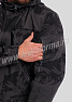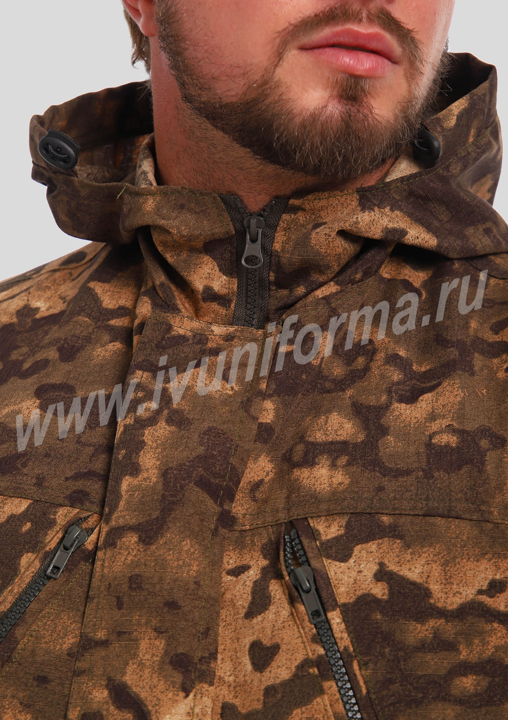 Костюм мужской состоит из куртки и брюк. Куртка удлиненная прямого силуэта, с застежкой на тракторную молнию с ветрозащитным клапаном на липучках "Velcro", воротник-стойка. На куртке два нагрудных кармана с косым входом на молнии и два нижних накладных кармана с клапанами и застежками на липучку "Velcro". Куртка имеет капюшон с возможностью регулировки объема . На рукавах куртки расположены карманы с застёжкой на молнию.