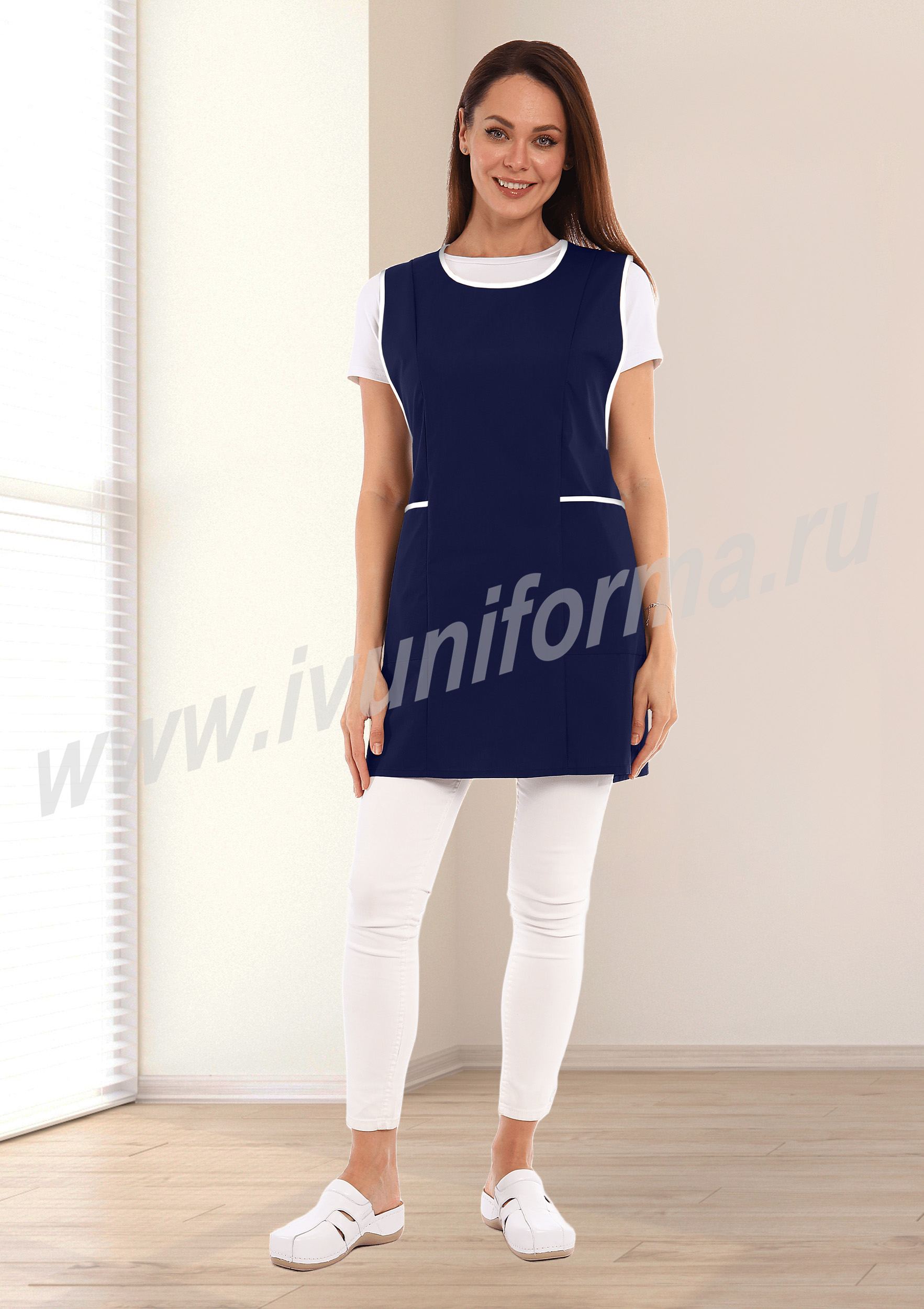 Фартук средней длины, перекидной. Спинка без отделки. Полочка с округлым вырезом горловины и рельефами, выходящими из плечевых швов, с двумя накладными вместительными карманами в нижней части фартука. Объем фартука по линии талии регулируется завязками – поясами. Изделие изготовлено из легкой и прочной смесовой ткани, с водоотталкивающей пропиткой, что придает фартуку универсальность при использовании его для защиты от общепроизводственных загрязнений в разных сферах деятельности.