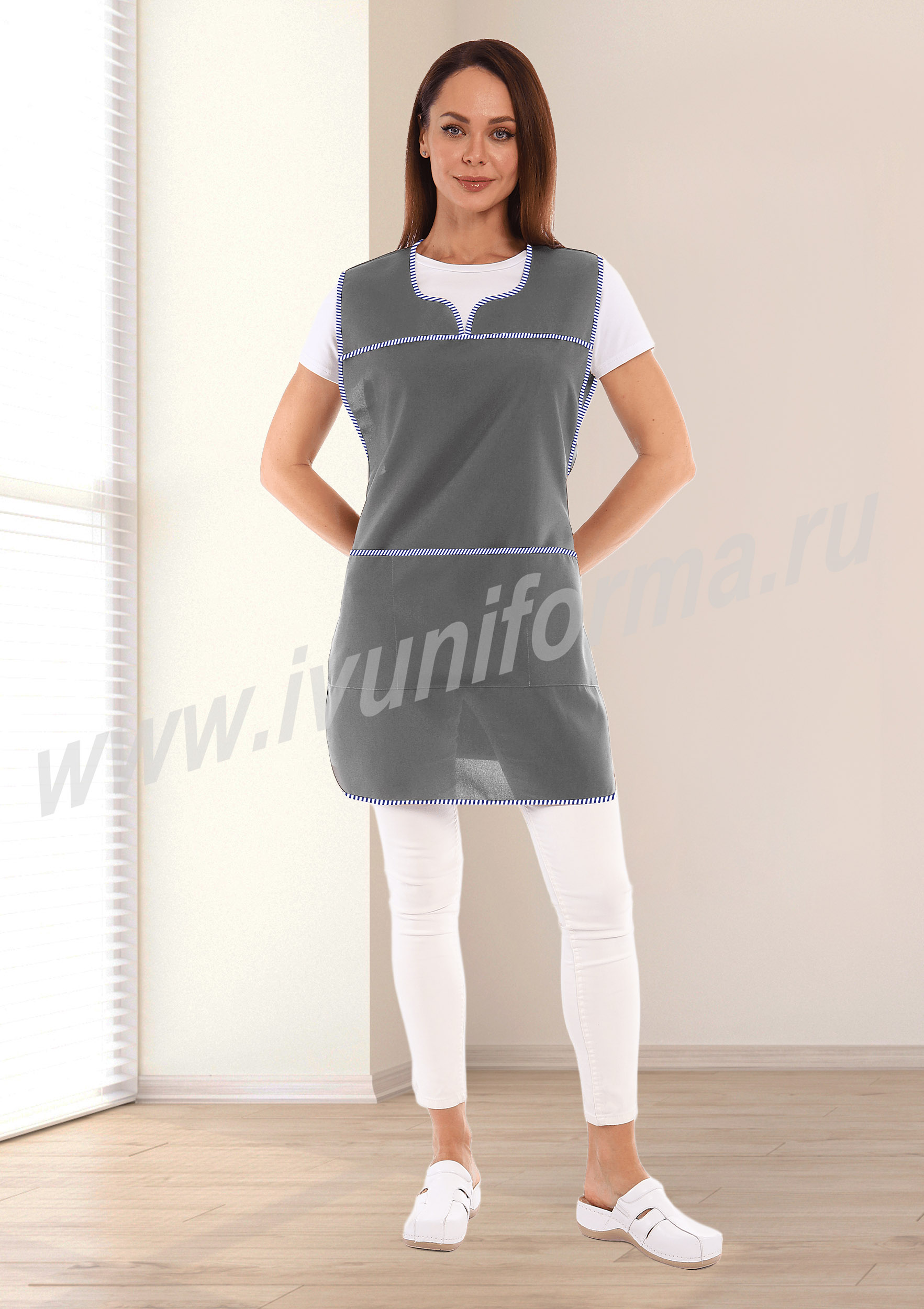 Фартук средней длины, перекидной, имеющий спинку без отделки и полочку с отрезными симметричными кокетками. В нижней части полочки расположены вместительные карманы. Объем талии фартука регулируется завязками – поясами. Все срезы фартука обработаны кантом из контрастной капроновой ткани. Фартук предназначен для защиты от общепроизводственных загрязнений.